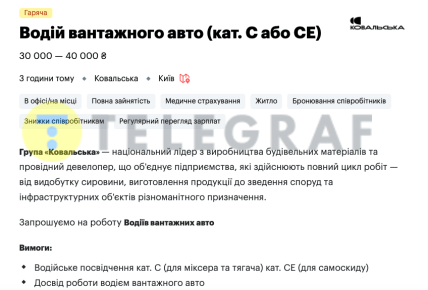 Українцям пропонують вакансію з бронюванням у місті Києві. На ринку праці з'явилася нова пропозиція для водіїв вантажного транспорту. Будівельна група "Ковальська", що є одним із лідерів галузі в Україні, оголосила набір водіїв категорії C та CE для роботи в Києві та області.