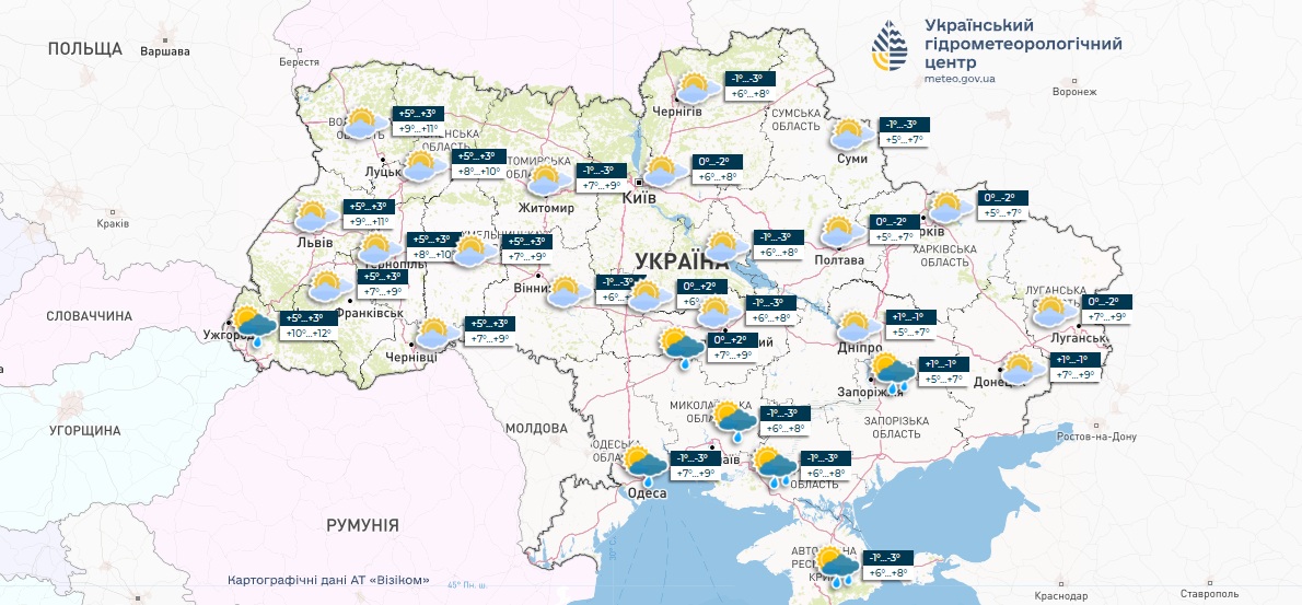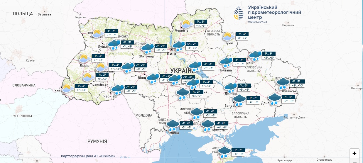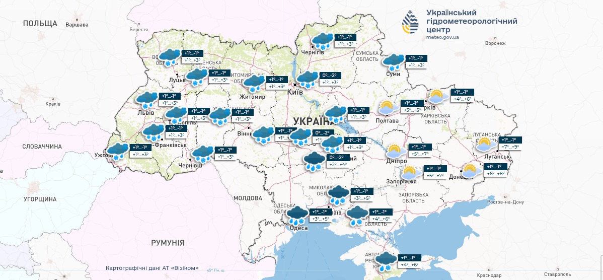 Так, із середи по п’ятницю середня температура повітря по всій країні складатиме +4…+7 градусів, а вночі — 0…-4. У багатьох регіонах очікуються дощі та мокрий сніг.