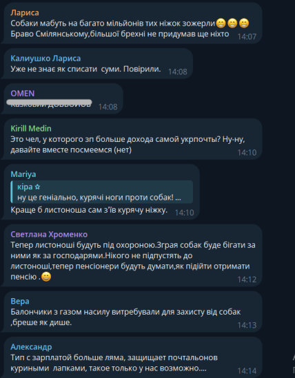 "Коли листоноша йде, а на нього біжить собака, він має дістати курячу ногу і кинути, щоб собака відволікся", — зазначив Смілянський.