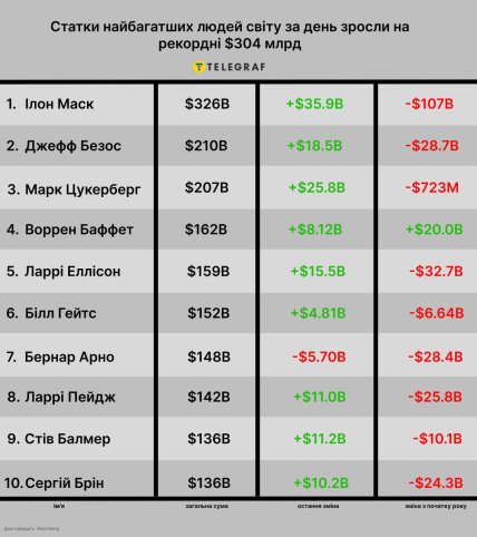 Найбільше зросли статки Ілона Маска (+$35.9 млрд), Марка Цукерберга (+$25.8 млрд) і Джеффа Безоса (+$18.5 млрд).