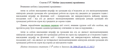 Зазначимо, що з грудня 2022 року в Україні офіційно діє закон, що визначає поняття мобінгу (цькування на роботі) та встановлює відповідальність за нього. Він гарантує працівникам захист і передбачає покарання для кривдників — як звичайних працівників, так і роботодавців.