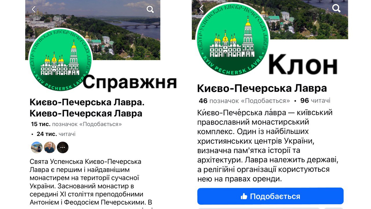 Так, у Facebook був створений клон сторінки Києво-Печерської лаври з ідентичним аватаром і навіть схожим описом. Втім, на відміну від справжньої сторінки, де публікується розклад богослужінь і новини УПЦ (МП), клон рекламує інший бізнес — чудодійний препарат від болю в суглобах.