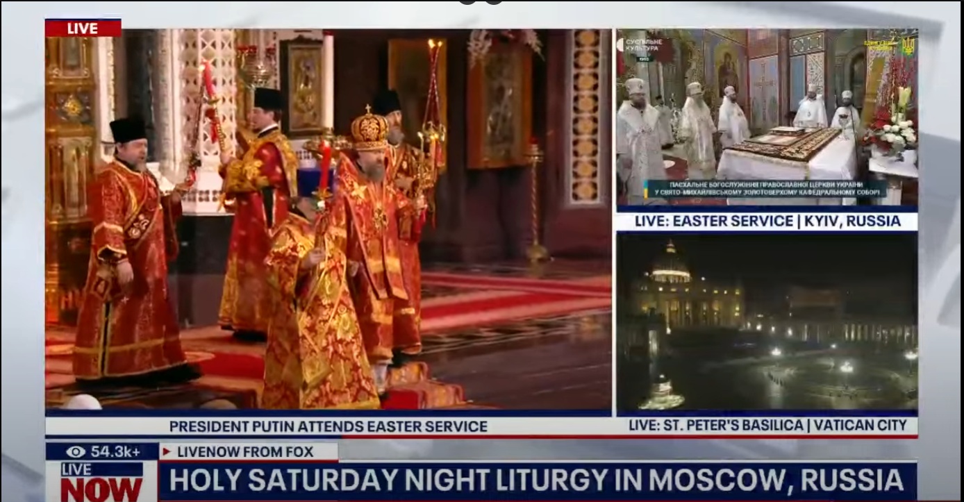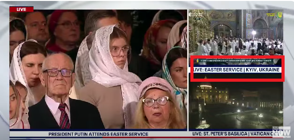 У світле Великодне свято, 20 квітня, американський Телеканал Fox News показував трансляцію глави РПЦ патріарха Кирила (Володимир Гундяєв), який підтримує війну в Україні та риторику Путіна. Крім цього, у своєму сюжеті вони вказали Київ як російське місто.