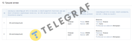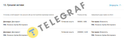 У розділі "Грошові активи" інспектор вказав, що зберігає готівкою 69 000 доларів США та 450 000 гривень. Роком раніше (згідно з декларацією) чиновник зберігав готівкою 50 тисяч доларів та 250 тисяч гривень.