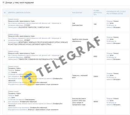 Згідно з декларацією за 2024 рік, Артем Лисенко на посаді інспектора Департаменту земельних ресурсів КМДА офіційно заробив понад 572 тисячі гривень. Крім того, чиновник задекларував інші доходи: виграш від компанії "ГЕЙМДЕВ" у розмірі 46 902 гривні, подарунок у негрошовій формі на 229 043 гривні від Катерини Лисенко та 480 000 гривень від продажу рухомого майна.