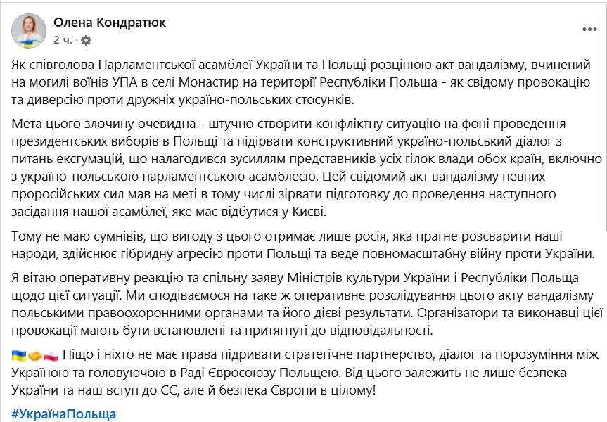 Заступник голови Верховної Ради, співголова Парламентської асамблеї України та Польщі Олена Кондратюк прокоментувала вандалізм на могилі воїнів УПА на горі Монастир у Підкарпатському воєводстві в Польщі. Вона розцінила це як спробу підірвати україно-польські стосунки.