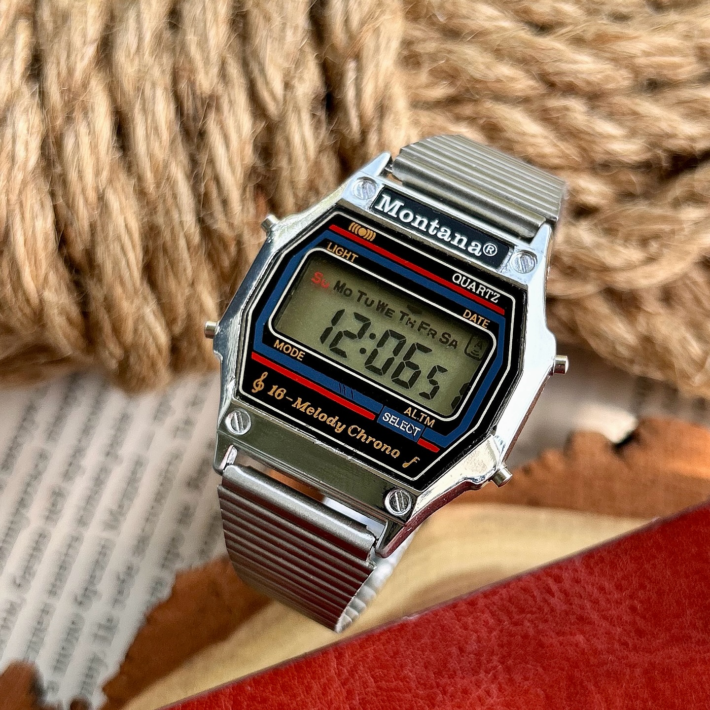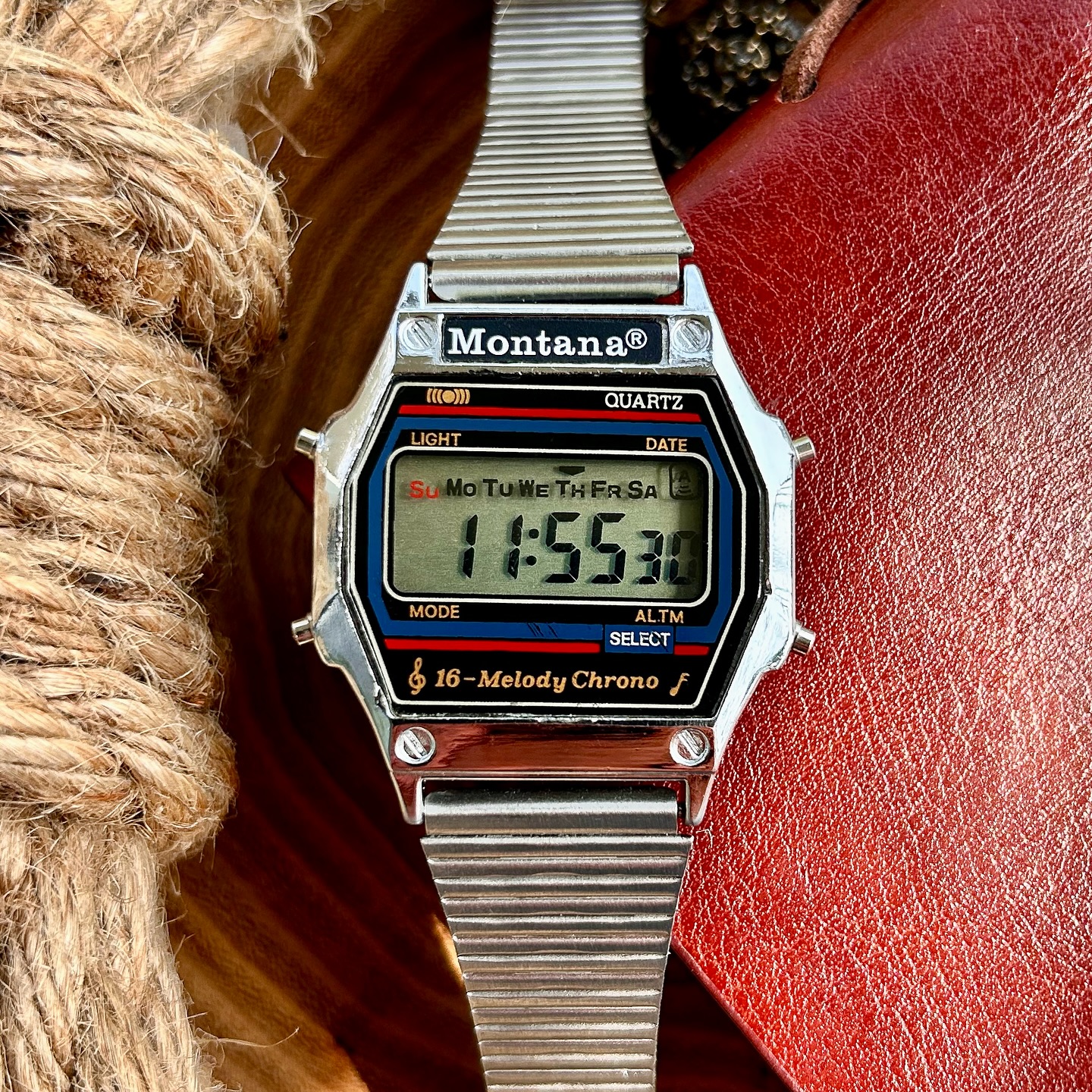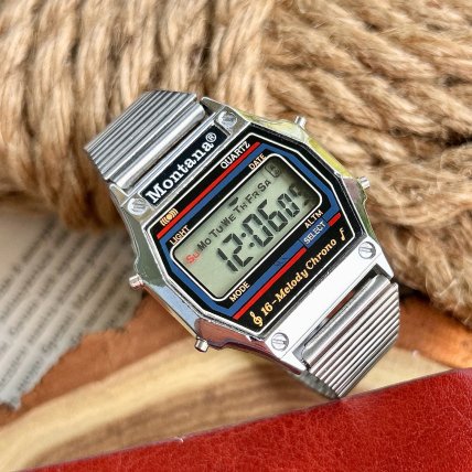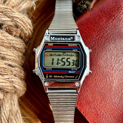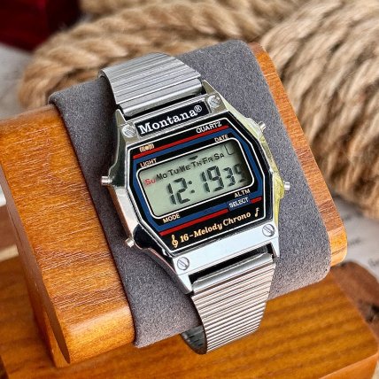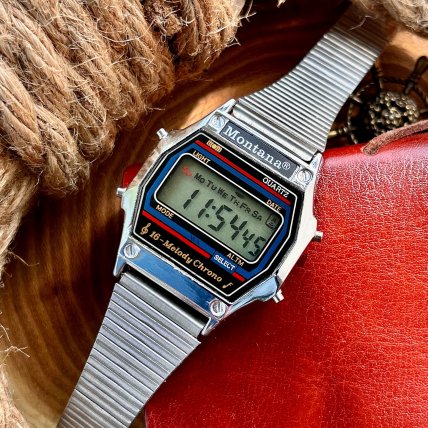 Модель годинника досить впізнавана: підсвітка, будильник, секундомір і набір вбудованих мелодій. Відмінний зовнішній вигляд та чудово збережений стан лише підкреслюють винятковість Montana. Є незначні сліди на задній кришці — це результат некоректного відкриття для заміни батарейки. Втім, годинник виглядає добре й усі функції працюють бездоганно.