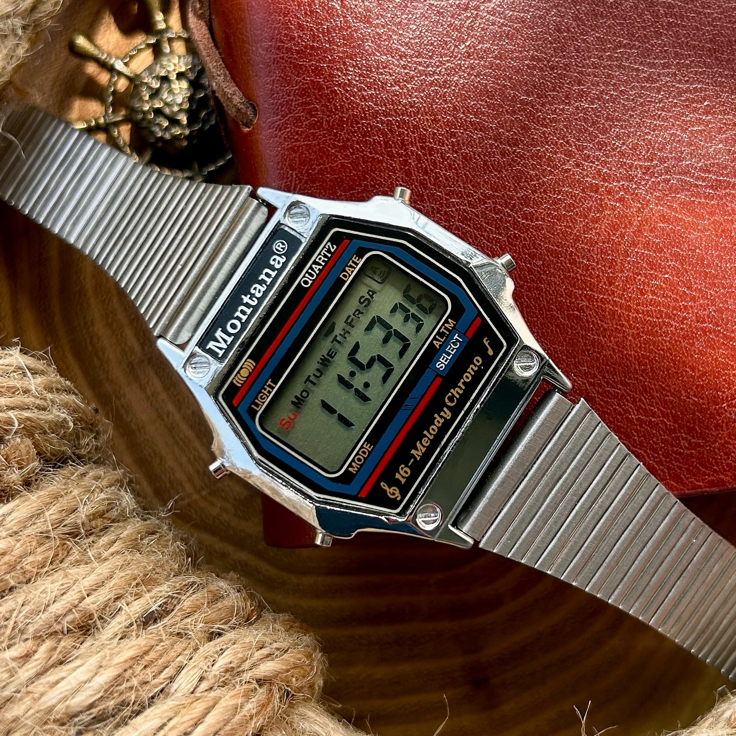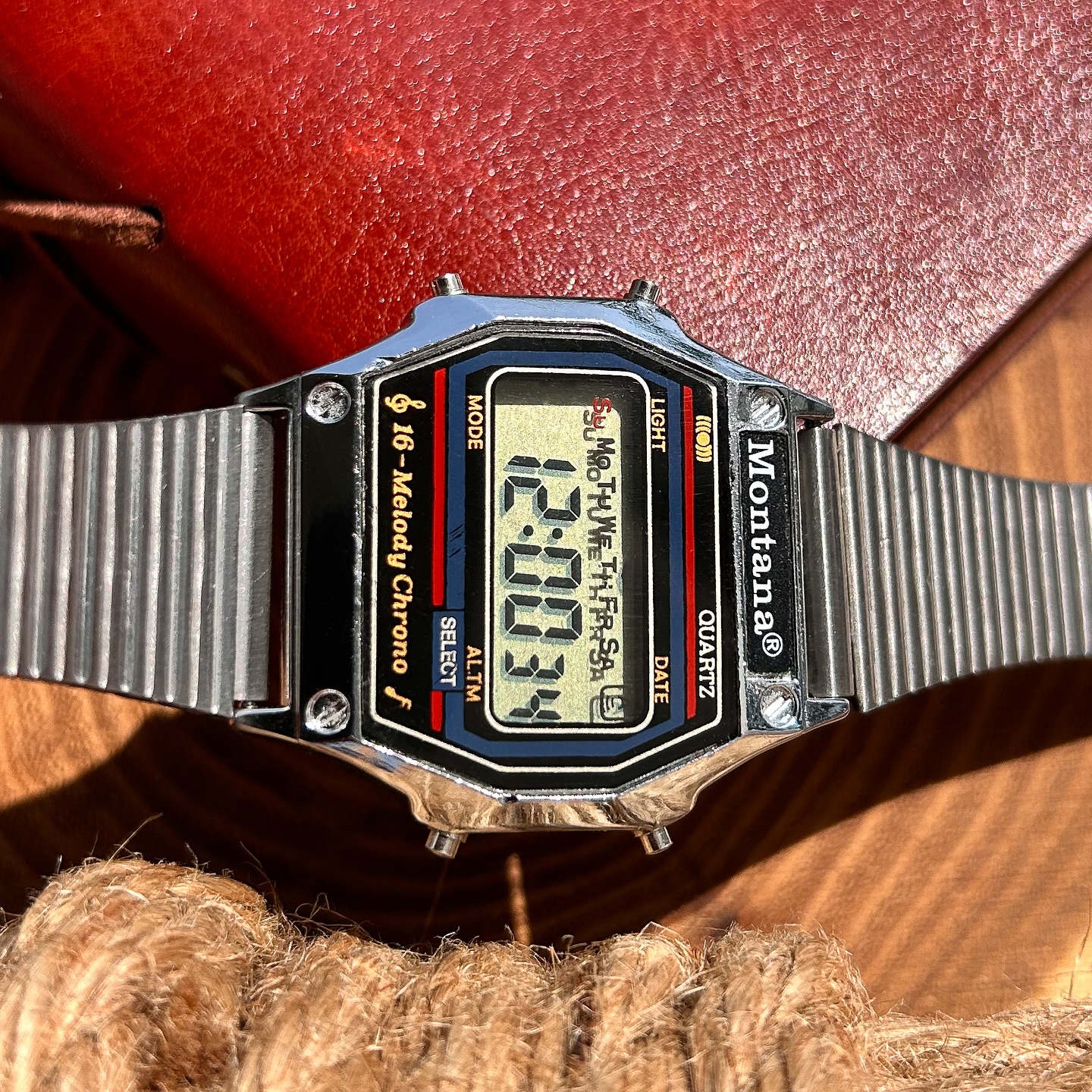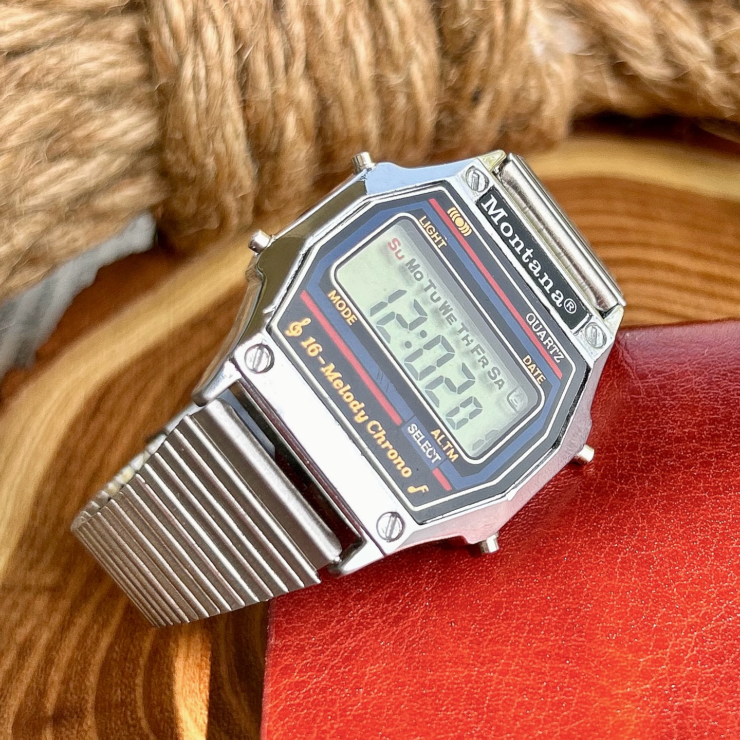 Модель годинника досить впізнавана: підсвітка, будильник, секундомір і набір вбудованих мелодій. Відмінний зовнішній вигляд та чудово збережений стан лише підкреслюють винятковість Montana. Є незначні сліди на задній кришці — це результат некоректного відкриття для заміни батарейки. Втім, годинник виглядає добре й усі функції працюють бездоганно.