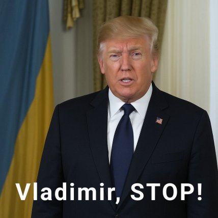 Згадали і українці президента-втікача Віктора Януковича. Зобразили Трампа на фоні українського прапора. Цей мем іронічно відсилає до знаменитої фрази Віктора Януковича "Астанавітєсь!", яку він сказав під час виступу у 2013 році, звертаючись до протестувальників на Майдані. Ця фраза стала мемом в українському інтернет-просторі через специфічний акцент та інтонацію. Тут проведено паралель між тією історичною фразою та нещодавнім зверненням "Vladimir, STOP!" у контексті реакції обстріл Києва.