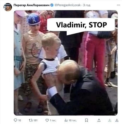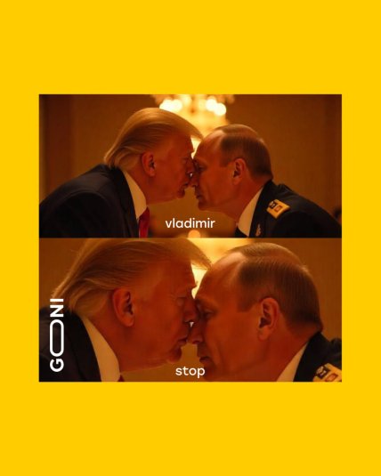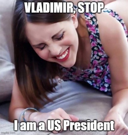 Не менш смішним є мем з двома чоловіками, які схожі на президента РФ і президента США в темних костюмах, які стоять дуже близько один до одного і майже торкаються обличчями. У верхній частині мему написано "vladimir", а в нижній — "stop". Цей мем — просто шедевр політичної сатири.Тут обіграно недавню фразу президента США "Vladimir, STOP". Замість серйозної дипломатії ми отримуємо романтичну комедію, де два світових лідери застигли в момент, який можна описати як "от-от поцілуються, але один шепоче іншому припинити".