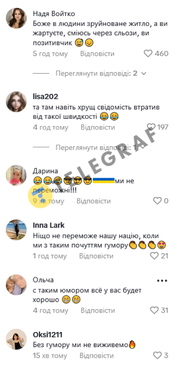 Користувачі соцмереж активно відреагували на відео. Більшість коментаторів відзначають неймовірний оптимізм та стійкість українців, які у найтяжчі моменти знаходять привід для жарту. "Боже, в людини зруйноване житло, а вона жартує, сміюсь через сльози", "Та там навіть хрущ свідомість втратив від такої швидкості", "Без гумору ми не виживемо" — пишуть у коментарях.