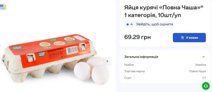 Курячі яйця торгової марки "Повна Чаша" першої категорії у мережі супермаркетів "Сільпо" коштують 69,29 гривень за упаковку з 10 штук. Це дещо дорожче порівняно з нефасованими яйцями у "Варусі", де десяток обійдеться покупцям у 53,90 гривень.