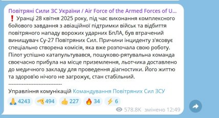 Су-27 розбився під час відбиття ворожої атаки 28 квітня. На щастя, пілот успішно катапультувався, його здоров'ю нічого не загрожує.