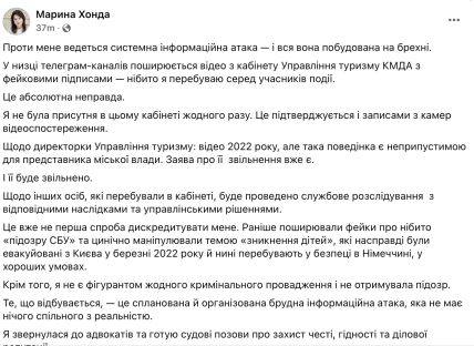 "Проти мене ведеться системна інформаційна атака — і вся вона побудована на брехні. У низці телеграм-каналів поширюється відео з кабінету Управління туризму КМДА з фейковими підписами — нібито я перебуваю серед учасників події. Це абсолютна неправда. Я не була присутня в цьому кабінеті жодного разу. Це підтверджується і записами з камер відеоспостереження", — пише Хонда.