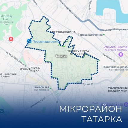 Головні вулиці Татарки – це Лук’янівська, Стара Поляна, Князя Володимира Мономаха, Татарська, Нагірна, Макарівська, Загорівська, Половецька та Печенізька.