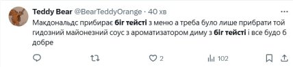 "Макдональдс прибирає біг тейсті з меню, а треба було лише прибрати той гидотний майонезний соус з ароматизатором диму з біг тейсті і все будо б добре", — пише користувачка.