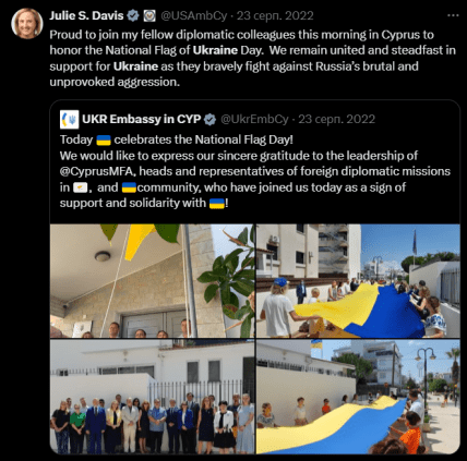 "Пишаюся тим, що сьогодні вранці на Кіпрі я разом зі своїми колегами-дипломатами вшановую День державного прапора України. Ми залишаємося єдиними та непохитними у підтримці України, яка мужньо бореться проти жорстокої та неспровокованої агресії Росії".
