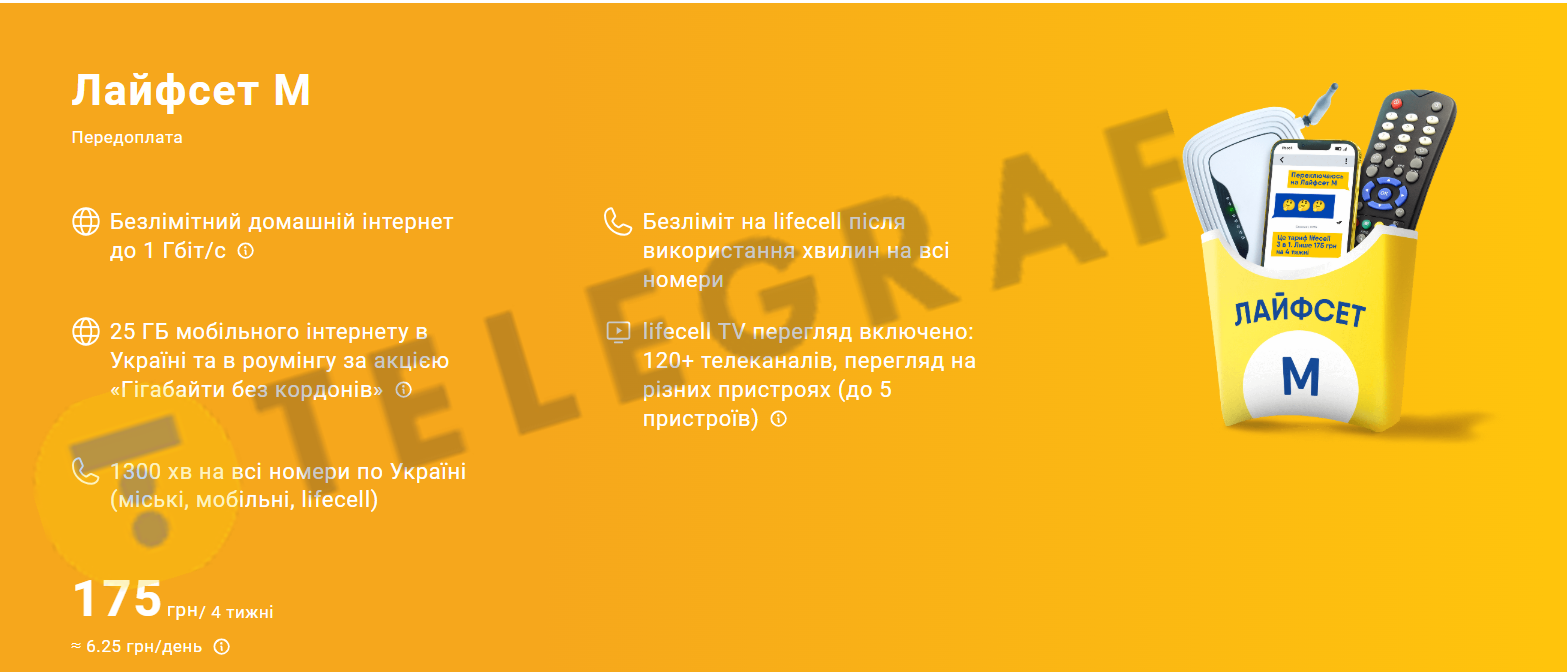 Про це повідомили на Facebook-сторінці Facebook lifecell. Йдеться про лінійку тарифних планів "Лайфсет". Один з них — Лайфсет М, вартістю 175 гривень на чотири тижні (6.25 грн/день).