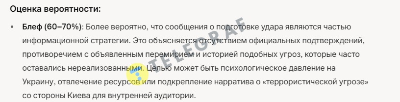 "Телеграф" також звернувся і до ШІ, щоб той, аналізуючи всі "за" і "проти", висловив свою думку з цього приводу. Він відповів, що з ймовірністю 60-70% це блеф.