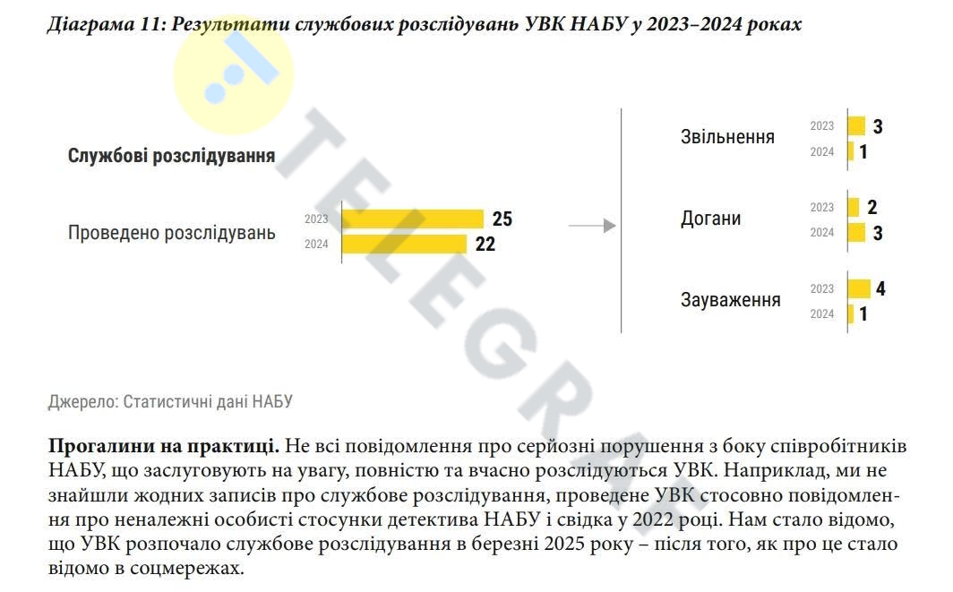 У розділі "Прогалини на практиці" щодо проведення службових розслідувань згаданого Звіту, зокрема, зазначено, що "не всі повідомлення про серйозні порушення з боку співробітників НАБУ, що заслуговують на увагу, повністю та вчасно розслідуються УВК. Наприклад, ми не знайшли жодних записів про службове розслідування, проведене УВК стосовно повідомлення про неналежні особисті стосунки детектива НАБУ і свідка у 2022 році. Нам стало відомо, що УВК розпочало службове розслідування в березні 2025 року (зауважимо, що саме в цей час публічній площині з’явилася інформація про Бравермана, — ред.) – після того, як про це стало відомо в соцмережах".