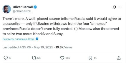 - Росіяни роблять відсилку до перемовин 2022-го року, але тоді вони контролювали 27% наших територій, а зараз — 18%.