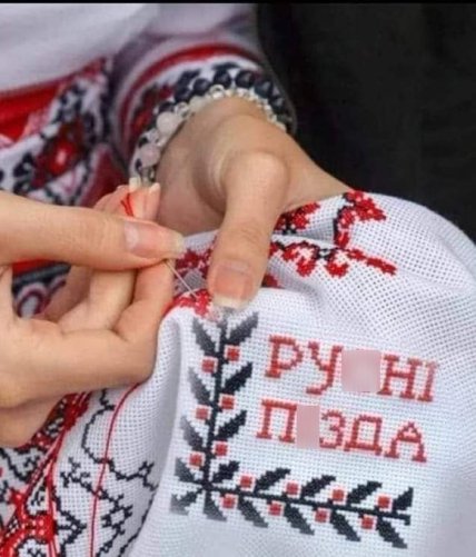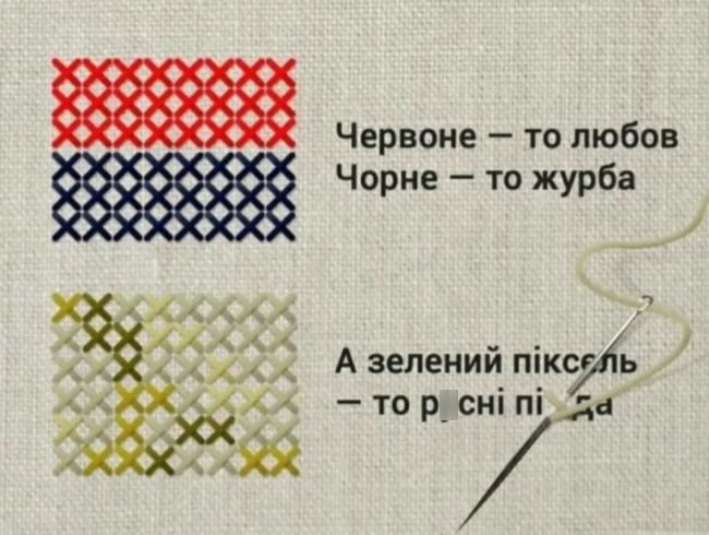 Подібний до попередньої картинки мем, у якому контрастує поетичний символізм кольорів вишиванки (любов, журба) із гострими почуттями до ворога — через використання військового "пікселю".