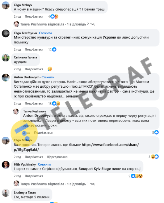Антон Дробович, колишній голова Українського інституту національної пам'яті, під дописом Пушнової зауважив, що дії МКСК без пояснень виглядають невмотивованими. "Це ж про керівництво національної святині в часі одної з найважливіших її реформ за останні століття. Тут все як під лупою розглядається суспільством, все зчитується як політичний сигнал", — написав він.