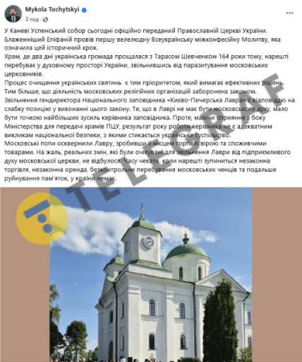 "Московські попи осквернили Лавру, зробивши її місцем торгівлі вірою. Реальних змін для звільнення від підприємливого духу московської церкви не відбулося", — заявив Точицький. Він додав, що країна не може чекати, поки зупиниться незаконна торгівля та присутність московських ченців.