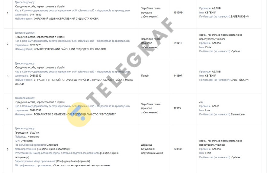 Сам Євгеній Аблов отримував торік зарплату в Окружному адміністративному суді Києва у розмірі понад 1,5 мільйона гривень та пенсію майже 149 тисяч гривень. Його колишня дружина працювала суддею в Комінтернівському районному суді Одеської області і мала зарплату 991 тисяча гривень.