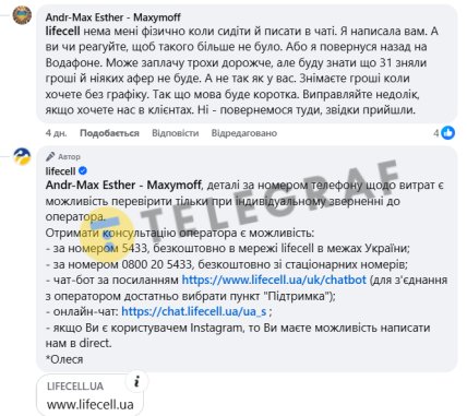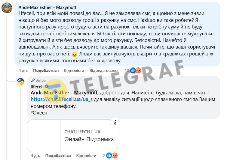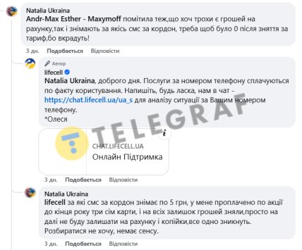 Через це клієнтка заявила, що більше не планує поповнювати рахунок на велику суму, а кладе туди лише мінімальні кошти, щоб уникнути неочікуваних списань. За її словами, компанія поводиться недобросовісно, а в мережі вже з'являється багато схожих скарг від інших користувачів, які звинувачують Lifecell у крадіжках грошей з рахунків.