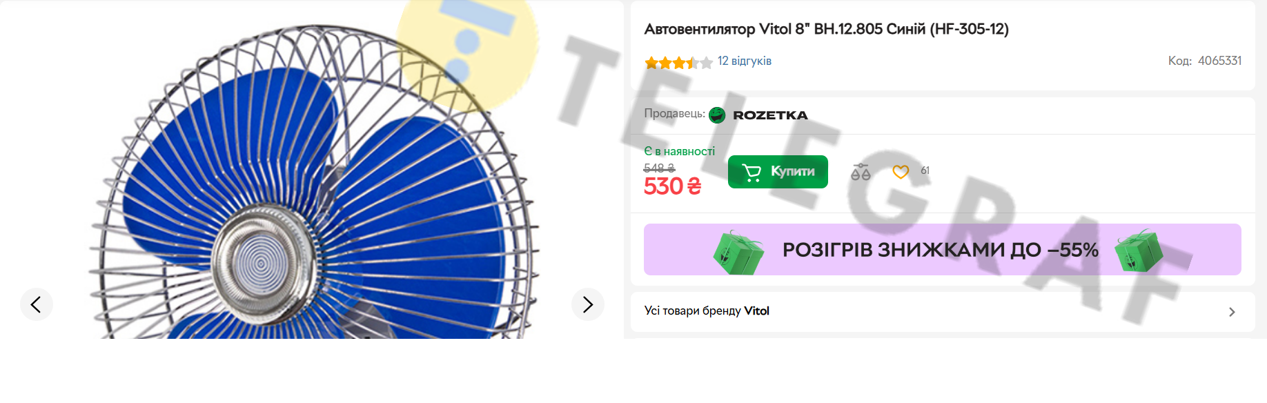 Автовентилятор Vitol 8" ВН.12.805 коштує 530 гривень. Працює від прикурювача, споживає 12 В.