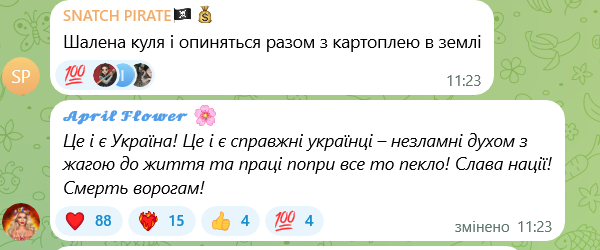 Втім, не всі поділяють таку думку. Один із користувачів з гіркою іронією зазначає: "Шалена куля — і опиняться разом з картоплею в землі". Проте інші наголошують на незламності українців. "Це і є Україна! Це і є справжні українці – незламні духом з жагою до життя та праці попри все те пекло!", — каже ще один глядач.