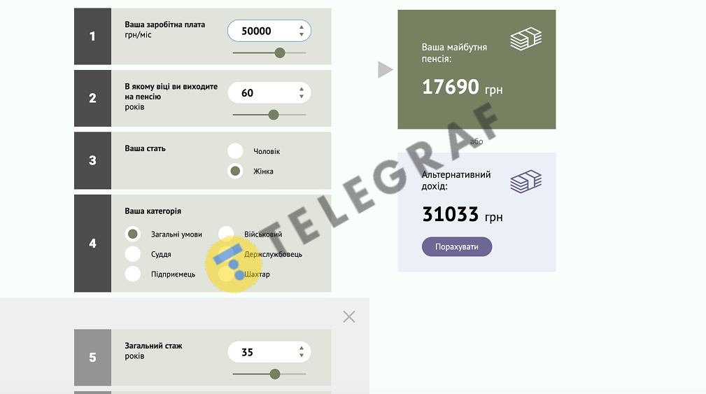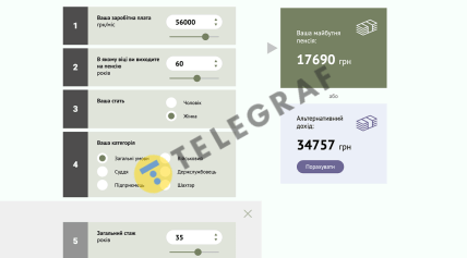 "Телеграф" дізнався, якою буде пенсія у жінки, яка отримувала заробітню плату у розмірі 50 тис грн. Ми використали спеціальний пенсійний калькулятор, аби зрозуміти, якої суми слід очікувати на відпочинку.