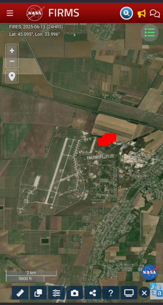 Про це повідомляє Telegram-канал "Кримський вітер". За його даними, після вибухів супутники NASA зафіксували пожежу біля аеродрому "Гвардійське". Зараз аеродром підпорядкований Повітряно-космічним силам РФ, там базується 37-й змішаний авіаційний полк.