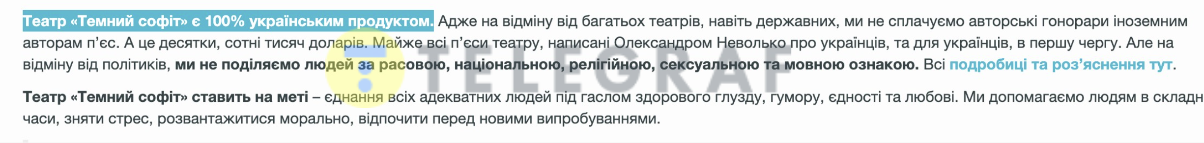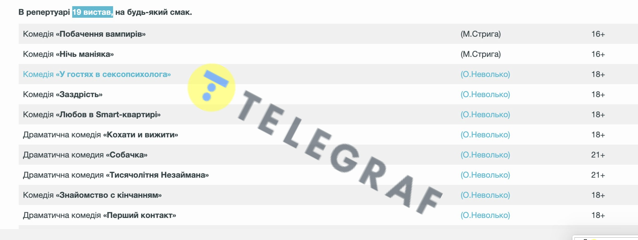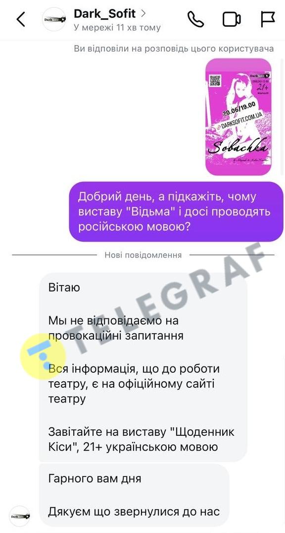 При цьому студія не одразу відповіла на запитання "Телеграфу" про точну кількість вистав українською. Спочатку там казали, що "працюють над збільшенням кількості україномовних вистав", однак наразі є лише одна — "Відьма". Також і дату, коли з'являться ще вистави українською, "Темний софіт" не зміг назвати.