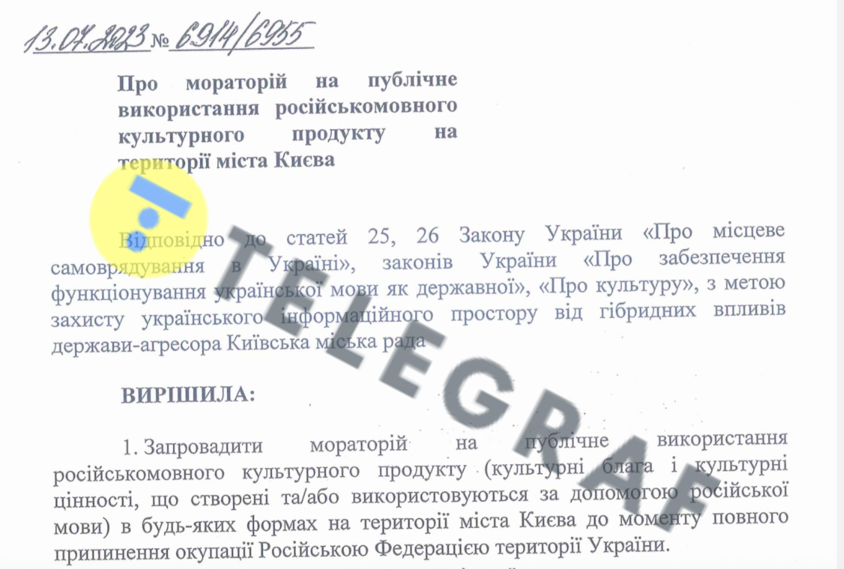 Водночас Київська міська рада з 13 липня 2023 року ввела мораторій на публічне використання російськомовного культурного продукту. Цей документ забороняє концерти, вистави, кіно, книги тощо російською мовою.