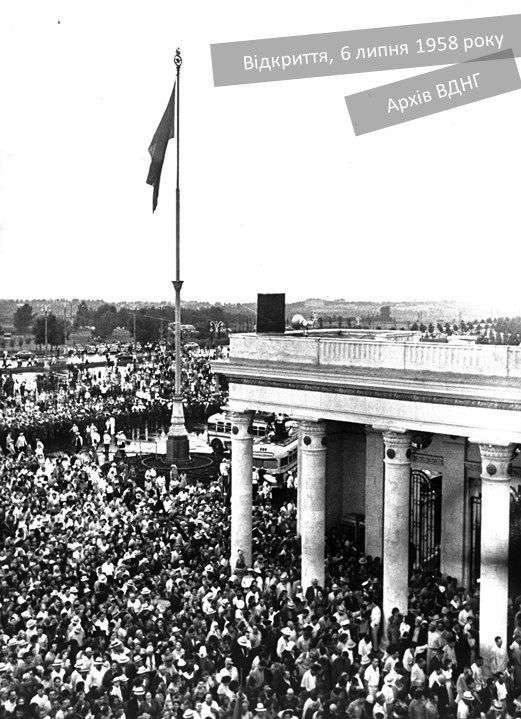 Будівництво тривало шість років — з 1952 по 1958 рік. 6 липня 1958 року комплекс урочисто відкрив свої двері для відвідувачів. Цікаво, що спочатку виставка називалася ВДНГ УРСР (Виставка досягнень народного господарства). Того дня мало хто міг передбачити, що ця виставка переживе розпад Радянського Союзу і стане важливим елементом незалежної України, змінивши назву на "Експоцентр України".
