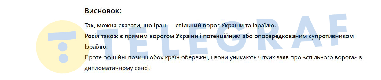 Штучний інтелект констатував, що Іран підтримує як ворога України — РФ, так і ворога Ізраїлю — ХАМАС, Хезболлу та інших терористів, що атакують Ізраїль. Тому, опосередковано Іран є ворогом обох країн.