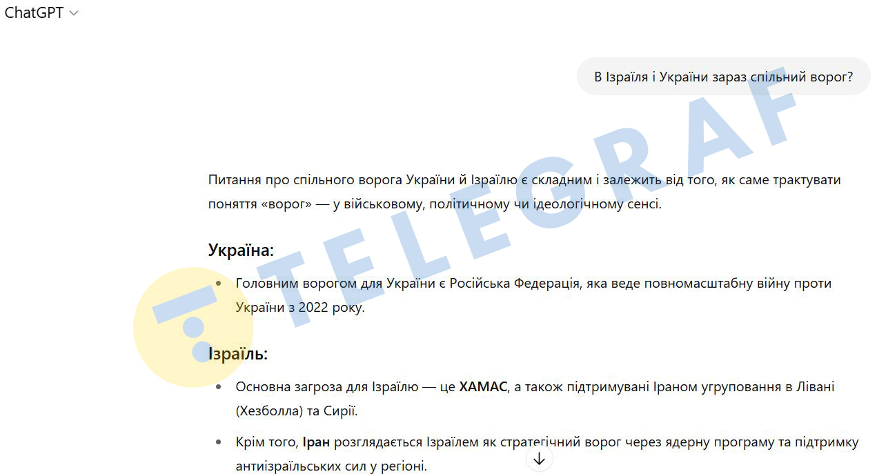 "Телеграф" звернувся до штучного інтелекту ChatGPT з запитанням, чи є Іран зараз спільним ворогом для Ізраїлю та України. ШІ зазначив, що відповідь залежить від трактування слова ворог — у військовому, політичному чи ідеологічному сенсі.