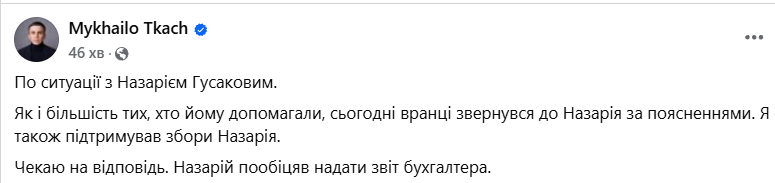 Відреагував і журналіст Михайло Ткач, який раніше також активно підтримував збори хлопця – він зауважив, що вранці звернувся до Назарія за поясненнями, той пообіцяв надати звіт бухгалтера.