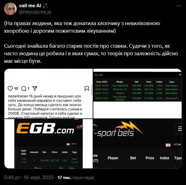 В інтернеті нічого не зникає безслідно, тож щойно підозри з’явилися в мережі, користувачі знайшли історію Назарія з 2013 року, коли він на одному з російських казино-форумів також збирав гроші, однак на лікування іншої хвороби – аміотрофії Вердніга-Гоффмана. У той період хлопець стверджував, що отримав це захворювання внаслідок вакцинації.