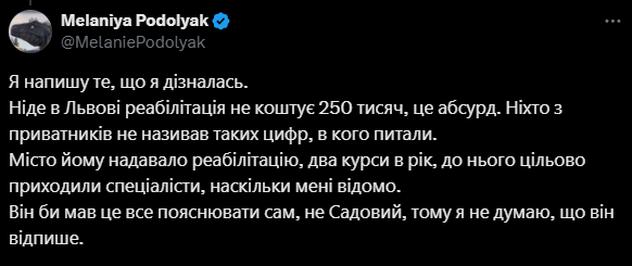 "Ніде у Львові реабілітація не коштує 250 тисяч, це абсурд. Ніхто з приватників не називав таких цифр, в кого питали", — написала Подоляк.