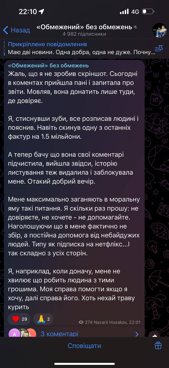 Трохи пізніше Назарій опублікував пост, який на момент публікації, вже є видаленим. В ньому він зауважив, що такі питання його деморалізують, а також закликав людей, які йому не довіряють, не надсилати йому кошти.