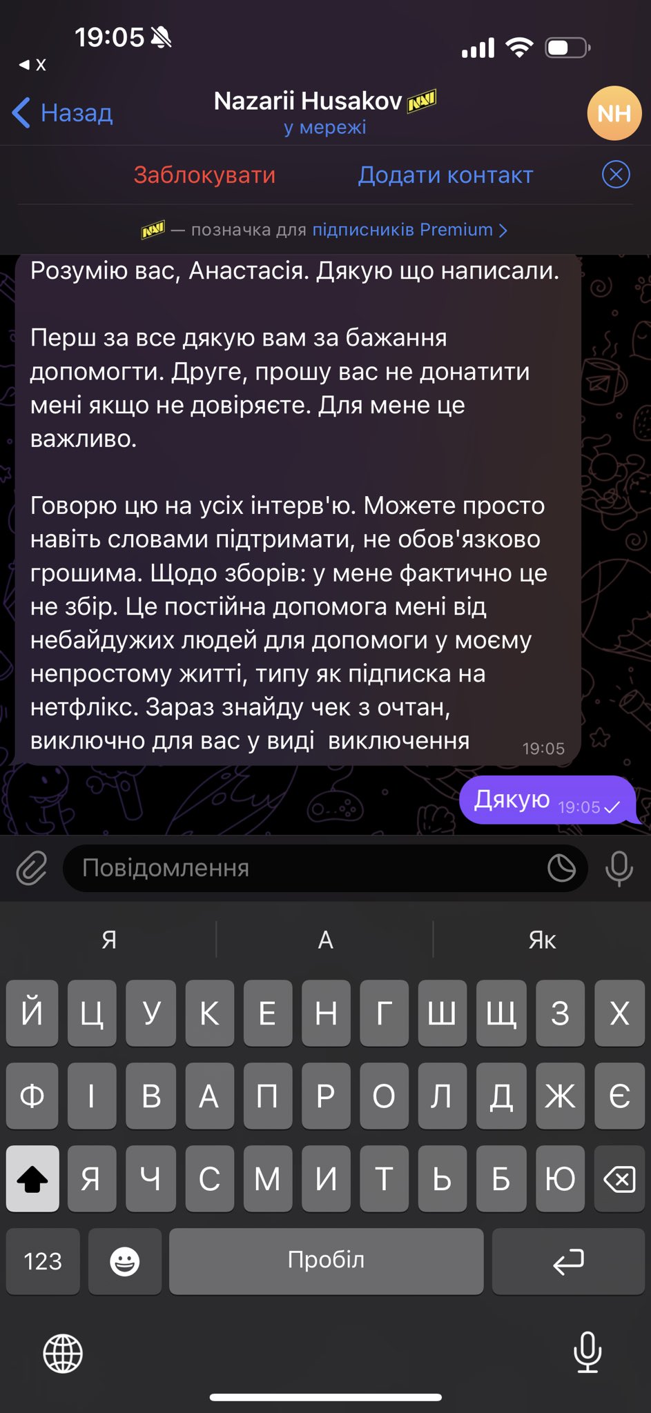 Коли ж користувачі звернулися в коментарях в Telegram-каналі самого Назарія з проханням надати більш чітку звітність, він відповів, що фактично має не збір коштів, а "постійну допомогу від небайдужих людей для допомоги в моєму непростому житті, типу як підписка на нетфлікс".