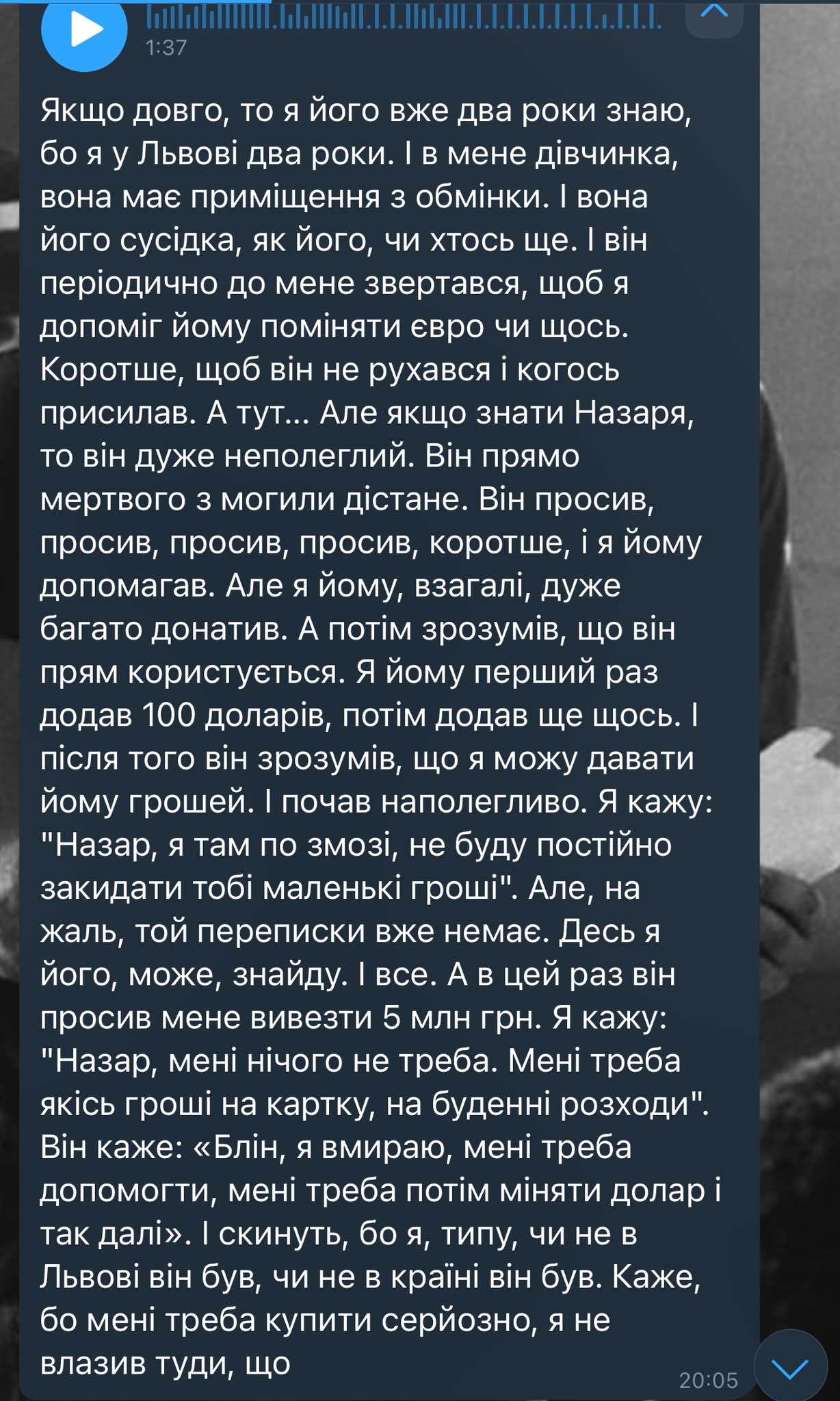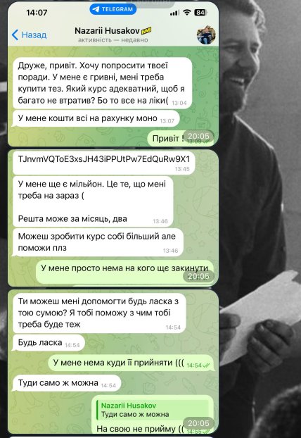 Денис, який сам вийшов на звʼязок з одною з користувачок, розповів, що протягом двох років допомагав Назарію з обміном валюти, іноді — з власних коштів. Проте з часом, за його словами, Назар почав зловживати допомогою — надсилав дедалі більше запитів на перекази, включно з проханням "вивести 5 мільйонів гривень". У коментарі Денис уточнив, що Назар не надсилав йому жодних ліків чи рецептів — лише просив поміняти долари, купити криптовалюту або переказати кошти назад.