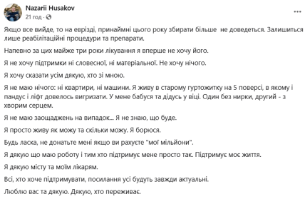 Після хвилі критики в соцмережах львів’янин Назарій Гусаков публічно відреагував на закиди щодо нецільового використання благодійних коштів. У коментарі "Суспільному" він заявив, що ніколи не відокремлював особисті доходи від пожертв, однак запевнив: усі кошти витрачав виключно на власне лікування, реабілітацію та побутові потреби.