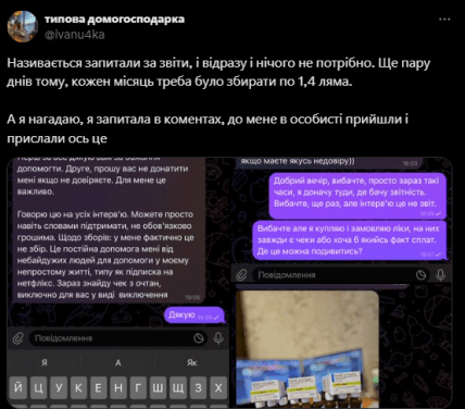 "На той момент, коли ми взяли постити на його підтримку, це вже зробили багато великих медійних майданчиків. Власне, через них він до нас і звернувся. Дуже складно відмовити людині, яка тобі пише "без ліків я помру". Ну і таки ж за діагнозом дійсно помре. І це щомісячна історія. Так як ми не збираємо гроші, а медійно підтримуємо, "звести всі його збори" в нас не було можливості. Але, якщо чесно, і думка така не дуже з’являлась. Ну в плані, людина щомісяця має отримувати дорогі ліки. Пише публічно скільки банок ліків йому виділило місто, скільки не вистачає. Постить скріншоти. Дуже складно її підозрювати.