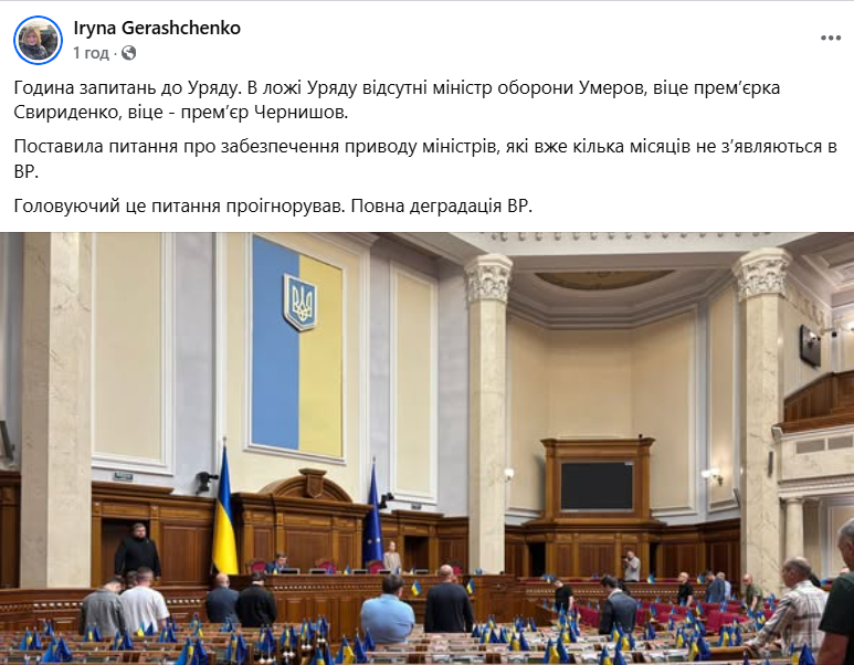 "Поставила питання про забезпечення приводу міністрів, які вже кілька місяців не зʼявляються в ВР. Головуючий це питання проігнорував. Повна деградація ВР", – дописала вона.