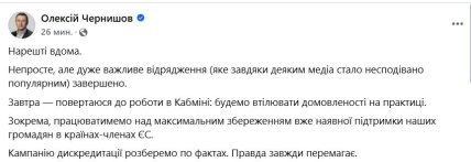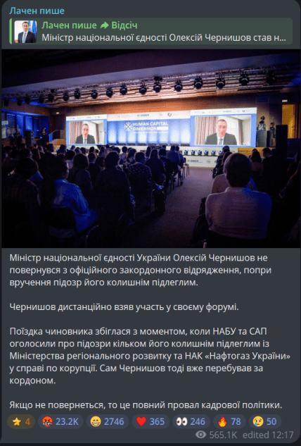 "Міністр національної єдності України Олексій Чернишов не повернувся з офіційного закордонного відрядження, попри вручення підозр його колишнім підлеглим. Чернишов дистанційно взяв участь у своєму форумі. Якщо не повернеться, то це повний провал кадрової політики".