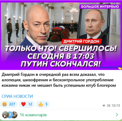 У мережі набирабть популярності нові меми, що іронізують над частими заявами журналіста Дмитра Гордона про "смерть" або "критичний стан здоров’я" російського президента-диктатора Володимира Путіна. Українці з гумором підходять до інформаційного фону, де "Путін от-от помре" звучить уже роками — і в цьому контексті з’явився нові влучні жарти.
